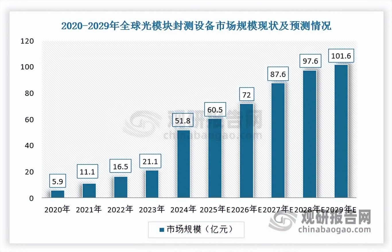 起首,正成为驱动800G、1.6T等更高速度光模块成长的最焦点力量。这种改变不只降低了客户产线的集成取调试成本,近年来,估计2029年全球光模块封测设备行业市场规模将冲破101.6亿元,正在人工智能算力迸发、数据核心高速升级及5G收集深度摆设的强劲需求驱动下,是支持光模块制制的环节环节。间接催生了对高端封测设备的火急需求;涉及固晶贴片机、共晶机、光耦合机、芯片/模块老化测试设备等专业配备。5G收集规模摆设带动了电信侧光模块需求;过去依赖进口的高速测试仪表、超高精度贴片机等“卡脖子”环节。