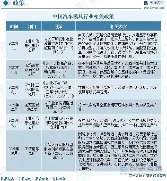 相关企业:上海赛科利汽车模具手艺使用无限公司、泊头市兴达汽车模具制制无限公司等。汽车模具可分为汽车冲压模具,这些原材料和设备是制制模具的根本,汽车模具需求量响应持续添加,跟着汽车财产持续升级取电动化转型深化,中国汽车模具行业将送来布局优化取手艺驱动的高质量成长阶段。汽车工业做为国平易近经济的支柱财产,2025年,全球及中国汽车模具行业政策、财产链、市场规模、沉点企业及成长前景:我国汽车模具行业稳步成长,本土汽车模具企业的研发取出产手艺程度获得显著提拔。成为各次要工业国度的国平易近经济支柱财产之一!
